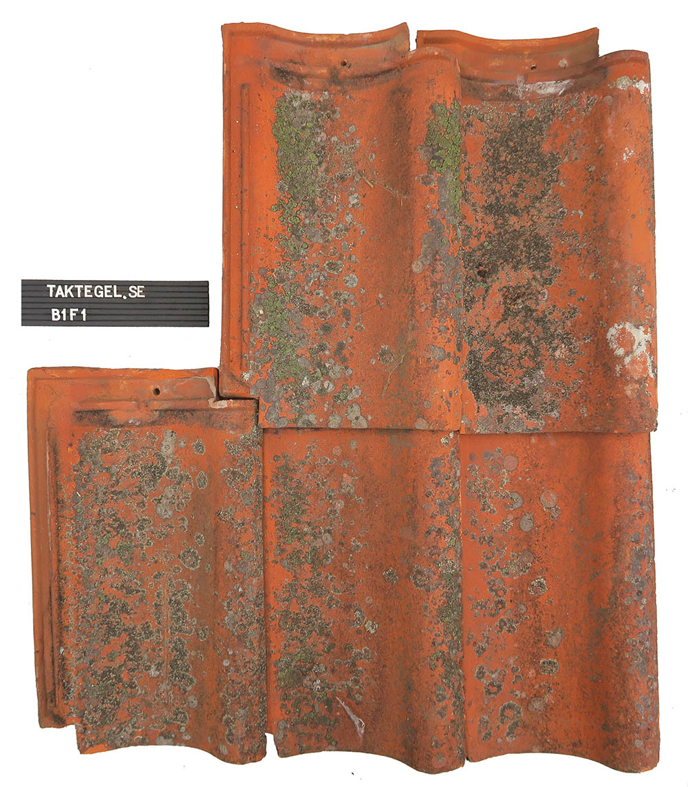 Formpressade takpannor från anrika Minnesbergs Tegelbruk i Trelleborg. Mycket god kvalité, något ljusa och kupiga. Pannorna har ganska mycket patina.